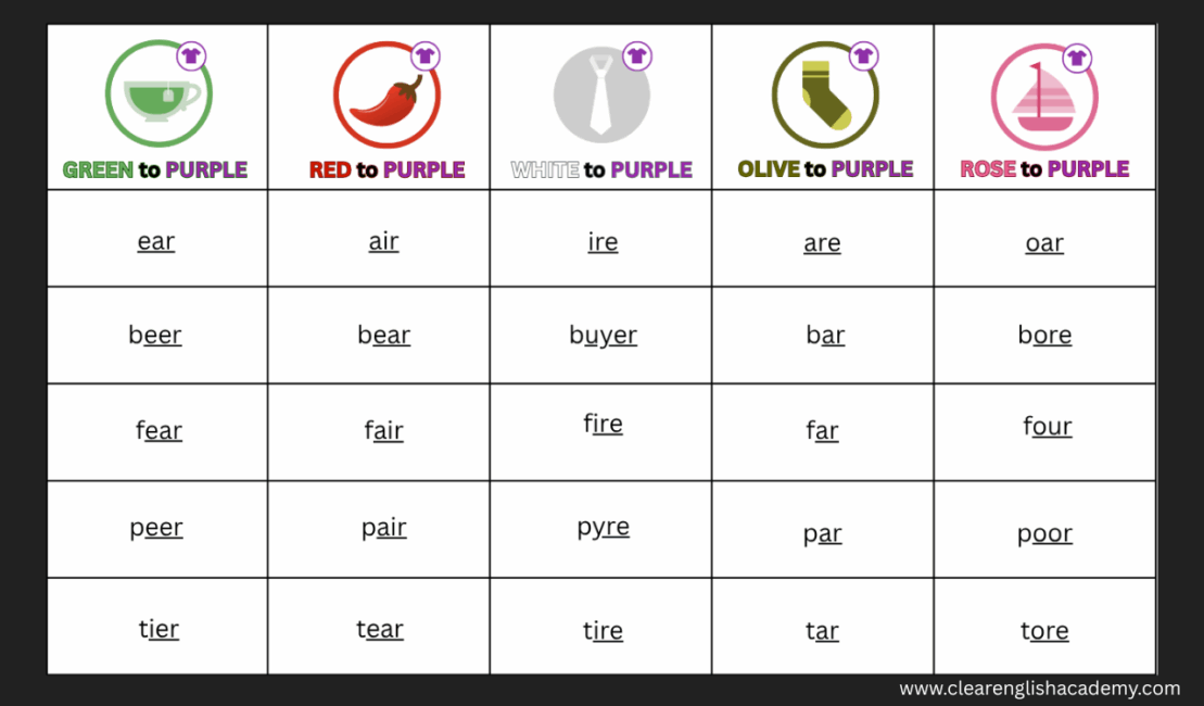 Many speakers aren’t used to pronouncing both parts of these moving vowel sounds, so the PURPLE SHIRT part often ends up swallowing the main vowel that comes before it.